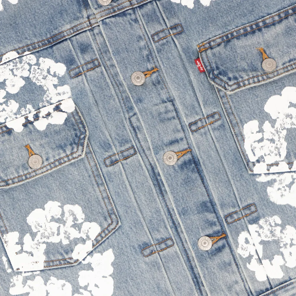 Denim Tears has dropped this statement denim jacket that showcases the label’s signature Cotton Wreath logo. Seen here in a neat blue iteration, the jacket features red tab across the chest pocket, silver-tone metal hardware and a traditional collar.