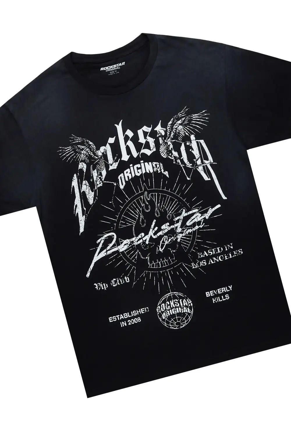 An urban rockstar two-piece graphic tee and stacked flare jean set for men. Designed with organic cotton and extra long legs for a dope streetwear outfit set.